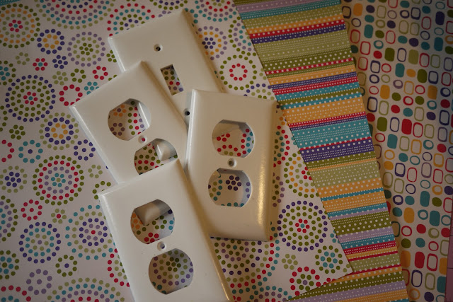 Sorry, I couldn't take a picture of the one on the right from anything but an angle, because I kept casting a shadow on it. The third outlet cover is covered in the circle dot paper, but it's behind the crib right now and I couldn't get a picture of it. As for the light switch cover (I keep wanting to say outlet plate...is that what they're called?), I did it in circle dot paper: